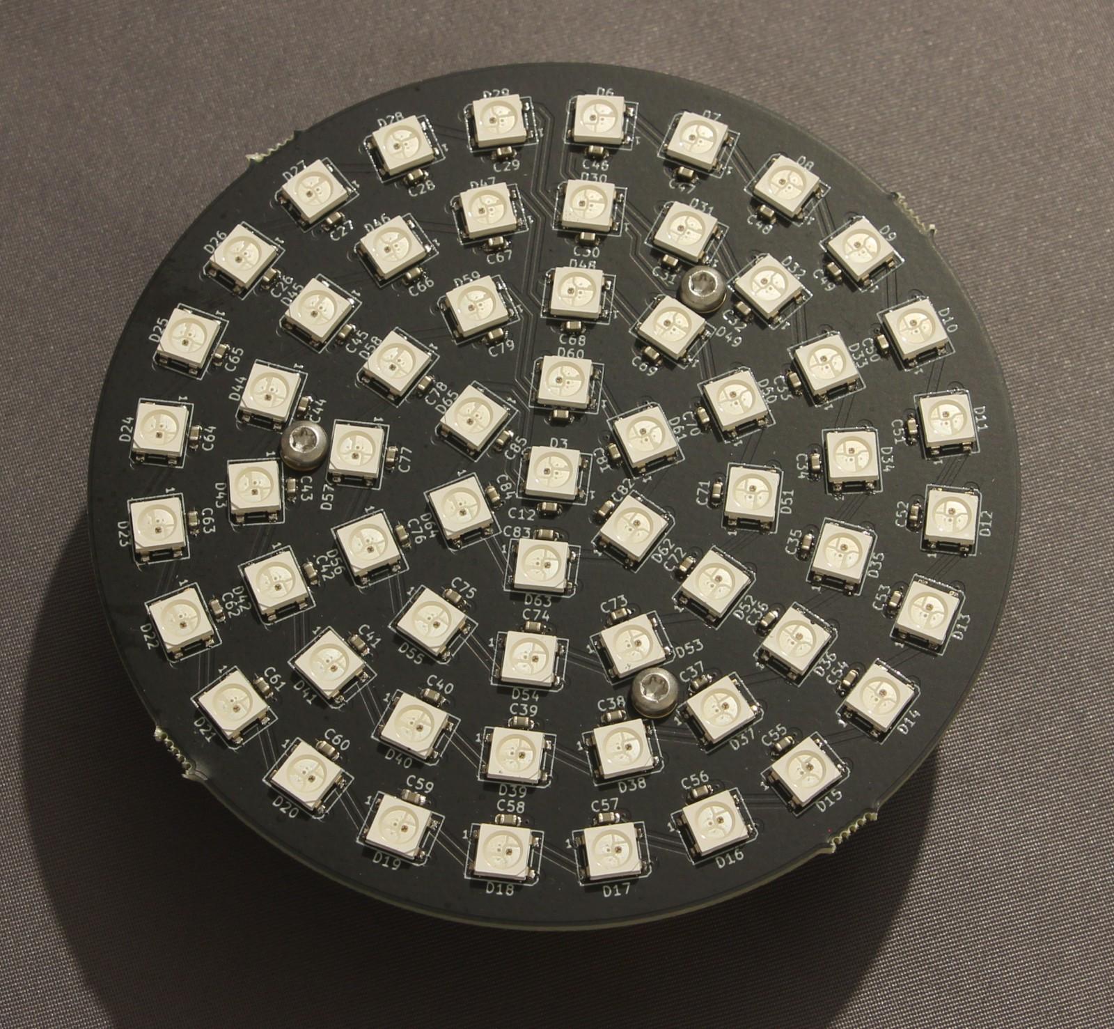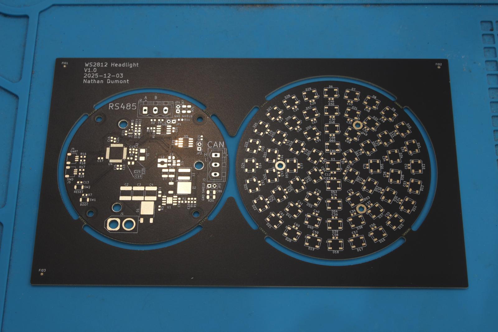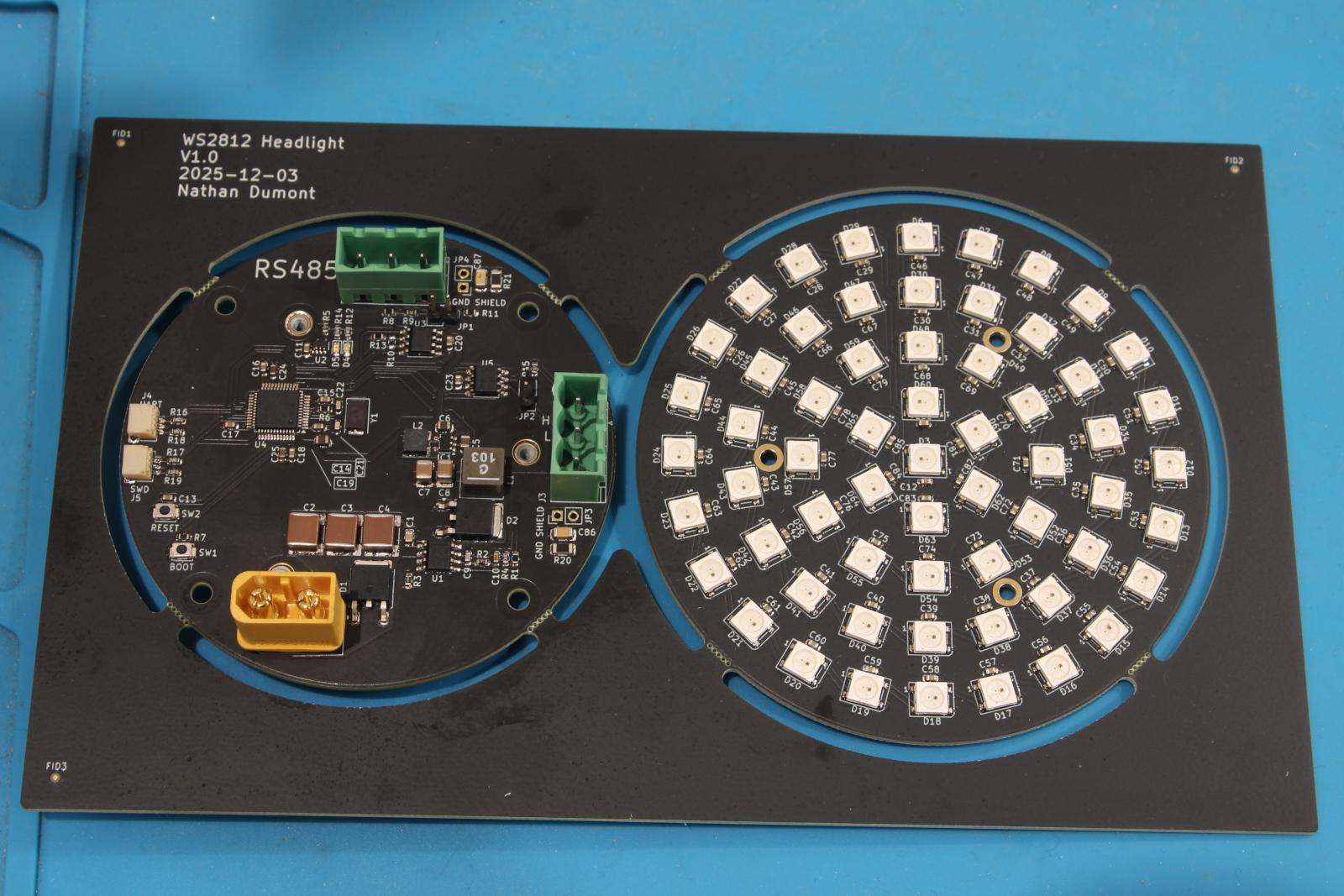 The brief was to have something about 100mm diameter and that could display a range of patterns and animations. I had a reel of standard WS2812B LEDs (like Neopixels) so they seemed like an obvious choice. We want to be able to connect the lights into whatever battery we use so we wanted a wide range of input voltages (at least 12 to 48V), and we want the animation of the lights to be related to the vehicle, maybe they look left and right as we steer, so we needed some sort of comms.