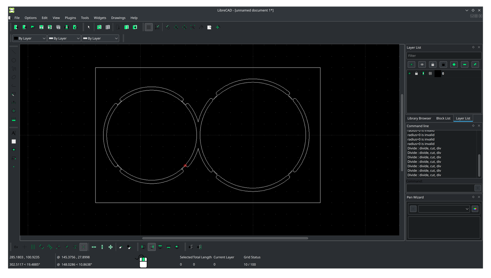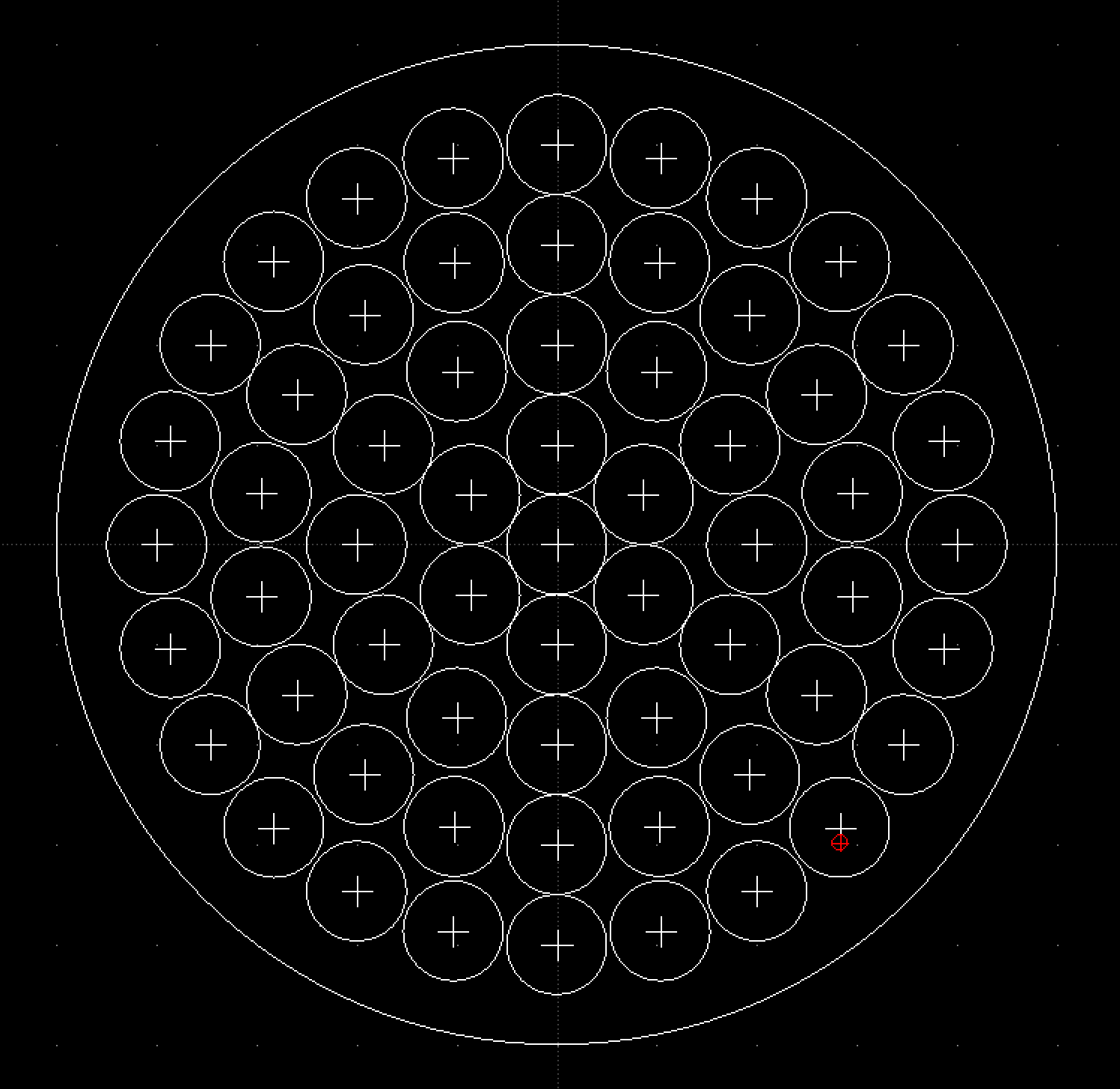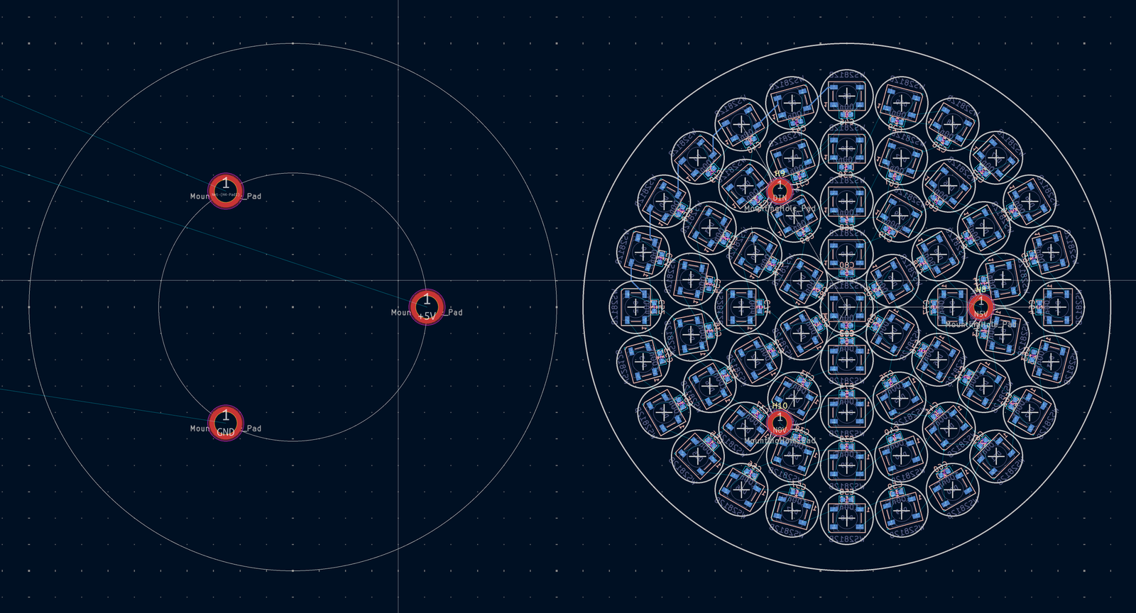 With all the design in place I pushed it over to the PCB and started to think about layout. Initially I had some LEDs but I hadn't figured out how many I'd use yet. The first thing I tackled was the LED array. I wanted to fill a 100mm disk as neatly as possible. First I tried a rectangular array but with decoupling caps the LED block was about 10mm across, this left a lot of empty spaces in the curves of the circle, it was more of a cross than a circle. A circular layout would have been difficult in just KiCAD but it has excellent import tools for DXF. I used LibreCAD which is a 2D design tool I've used a lot. I drew a sequence of circles and radial spokes which is easy with the tools it provides. At the intersection of each I left a little cross (again easy with the layoout and snap tools in LibreCAD). I exported this little constellation of crosses as a DXF and then imported them into KiCAD. In KiCAD with the layer I imported to them active when I move an LED its centre point snaps to the little cross I made. I rotated the LEDs to match their location to make a clean circular pattern then I finally rotated all the capacitors to match and placed one next to each LED. As I progressed through this process I figured out how many LEDs I actually needed and extended the array in the schematic to match.